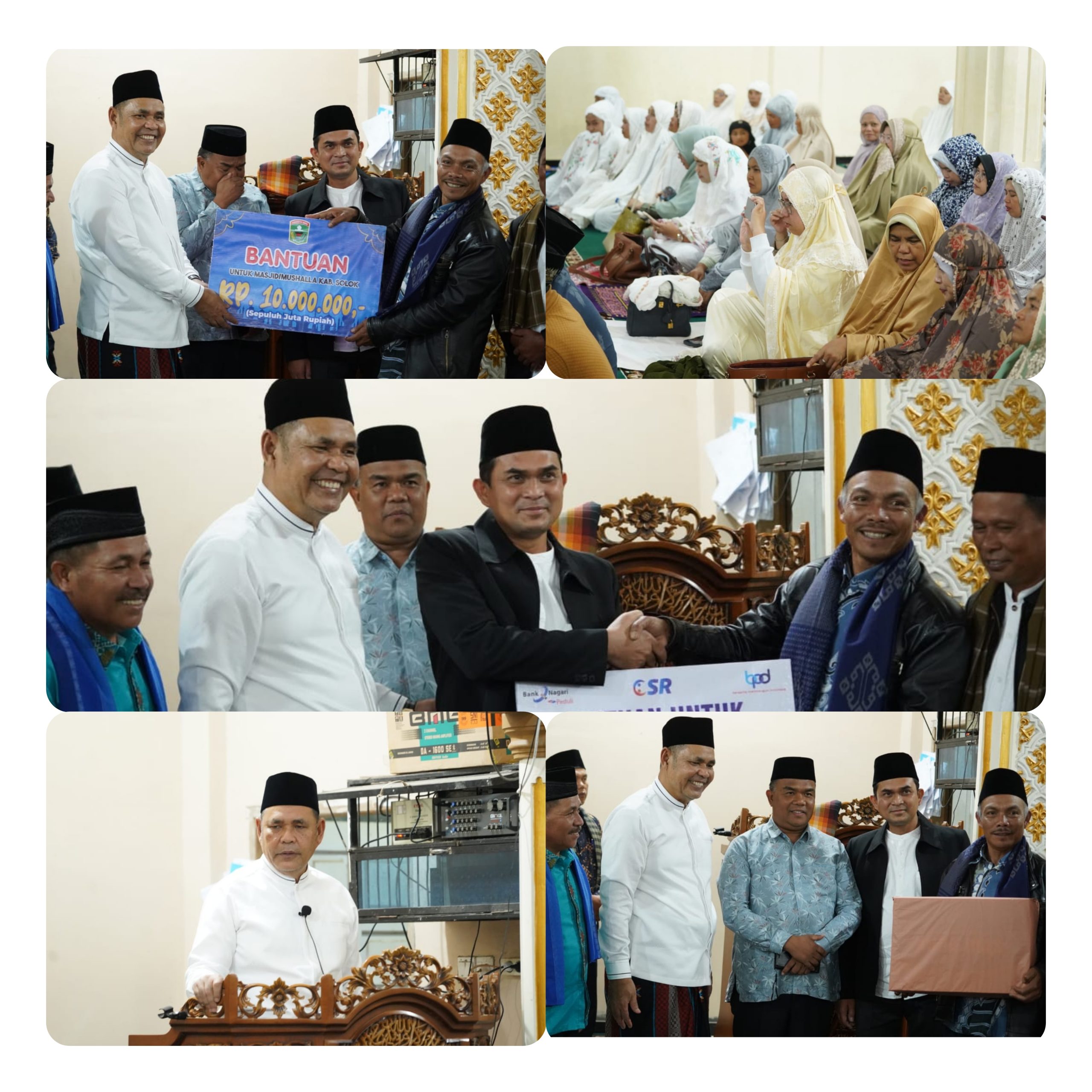 Sebelumnya kita mendengar Laporan dari Pengurus Mesjid, bahwa saat ini mesjid kita ini sangat membutuhkan tempat berwudhu yang lebih baik, Untuk itu silahkan manfaatkan Bantuan Pemerintah Daerah hari ini sebesar 10 Juta Rupiah dan akan saya tambahkan melalui gaji pribadi saya sebagai Bupati sebesar 5 Juta Rupiah serta malam ini juga ada bantuan tunai dari Bank Nagari sebesar 2,5 Juta Rupiah. Semoga bantuan ini dapat bermanfaat untuk membantu kebutuhan Mesjid kita ini.