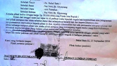 Siborong-borong – Straightnews.id // Diduga telah terjadi kejadian Pemalsuan Dokumen jual beli Tanah di Desa Bahalbatu III, Kecamatan Siborongborong, Kabupaten Tapanuli Utara, Provinsi Sumatra Utara. Dugaan ini menguat setelah ditemukannya berbagai tanda tangan yang dipalsukan, salah satunnya a/n James Sihombing sebagai sipemilik Tanah Ahli waris. Kejadian Peristiwa ini juga telah melibatkan nama Pembeli, Tioman Lumbantoruan dan mendiang penjual Nai Netti br. Situmeang Ibunda Si Pemilik Ahli Waris tersebut dalam transaksi sebidang tanah.