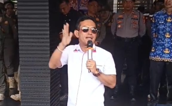 Mewakili Bupati Muara Enim, Andi Wijaya selaku Asisten I Pemkab Muara Enim, didampingi Kepala BKPSDM dan Plt Kasatpol-PP menanggapi apa yang di sampaikan oleh Gabungan Aktivis Ormas Muara Enim Sumsel Bersatu.