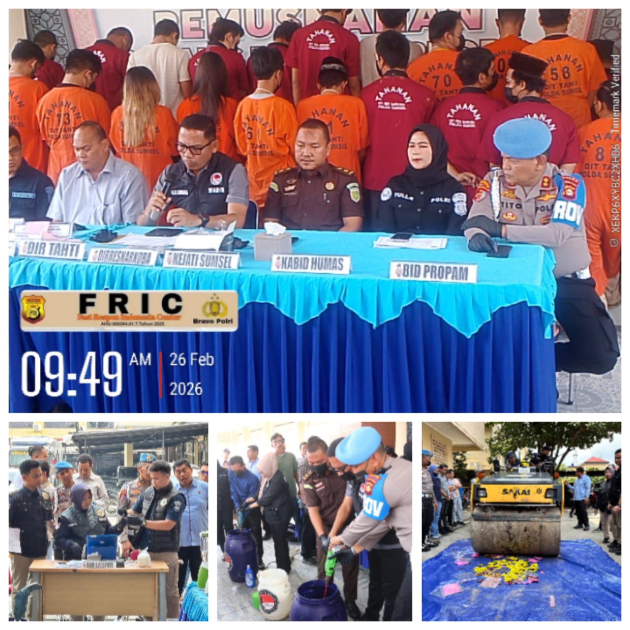 Sebelumnya, Satresnarkoba Polrestabes Palembang juga telah memusnahkan 8.282 gram sabu dan 770 butir ekstasi pada 24 Februari 2026, mempertegas konsistensi penindakan di wilayah hukum Sumatera Selatan.